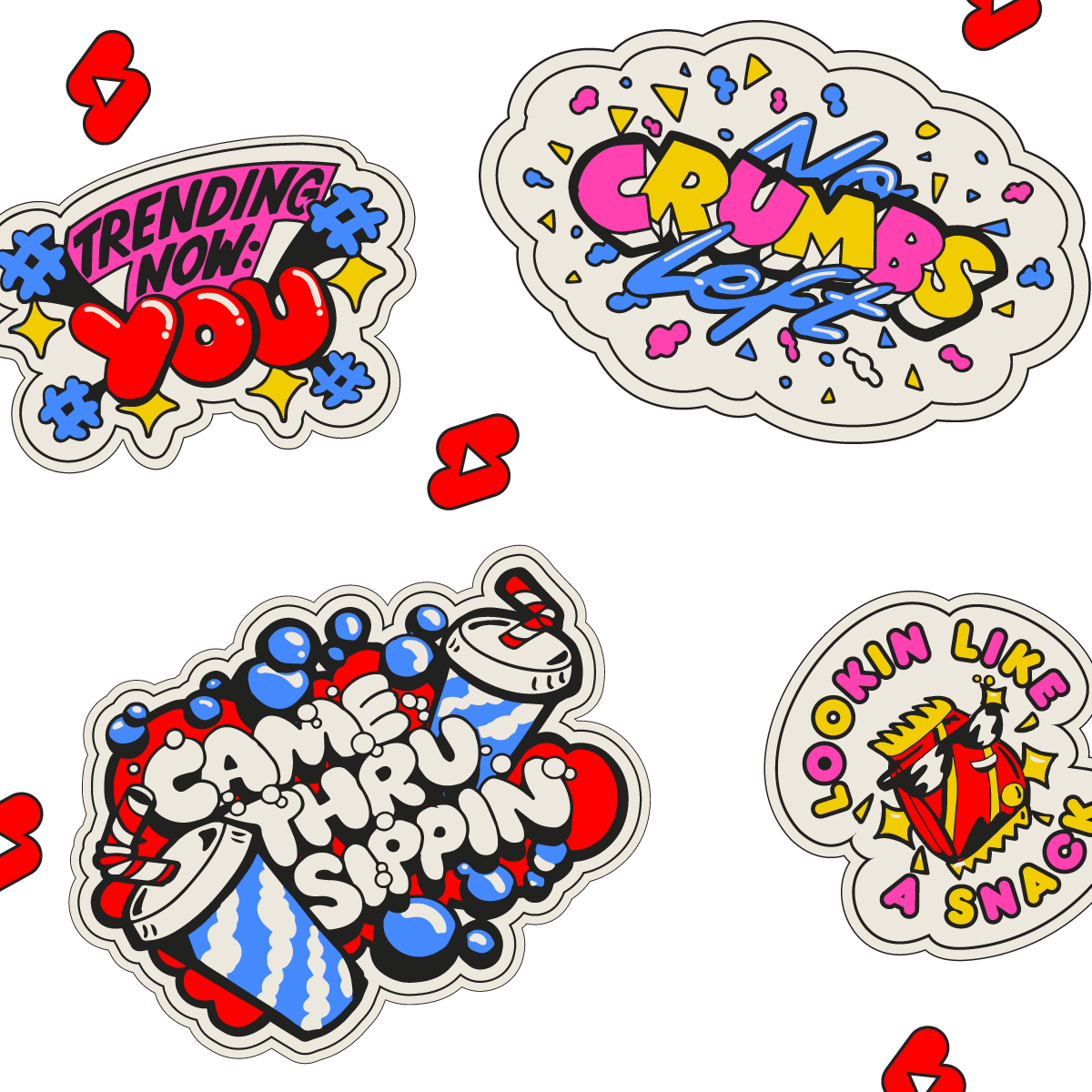 I did a series of fun illustrations and letterings to be used in online communications and packaging for YouTube Shorts Drive Thru at VidCon 2022. VidCon is the online video industry’s most notable annual gathering. This year, YouTube presented their newly released app Short by building a pop up Drive Thru inside the convention. There you could drive a golf-cart and pick up delicious goods. Shorts, "the shorter side of YouTube" played around the idea of snackeable content and materialised the analogy by offering a variety of snacks branded with YouTube creators. The Drive Thru was a colourful and fun activation to bring back that sugary feeling of excitement we had when we were kids going to our favourite fast food restaurant.